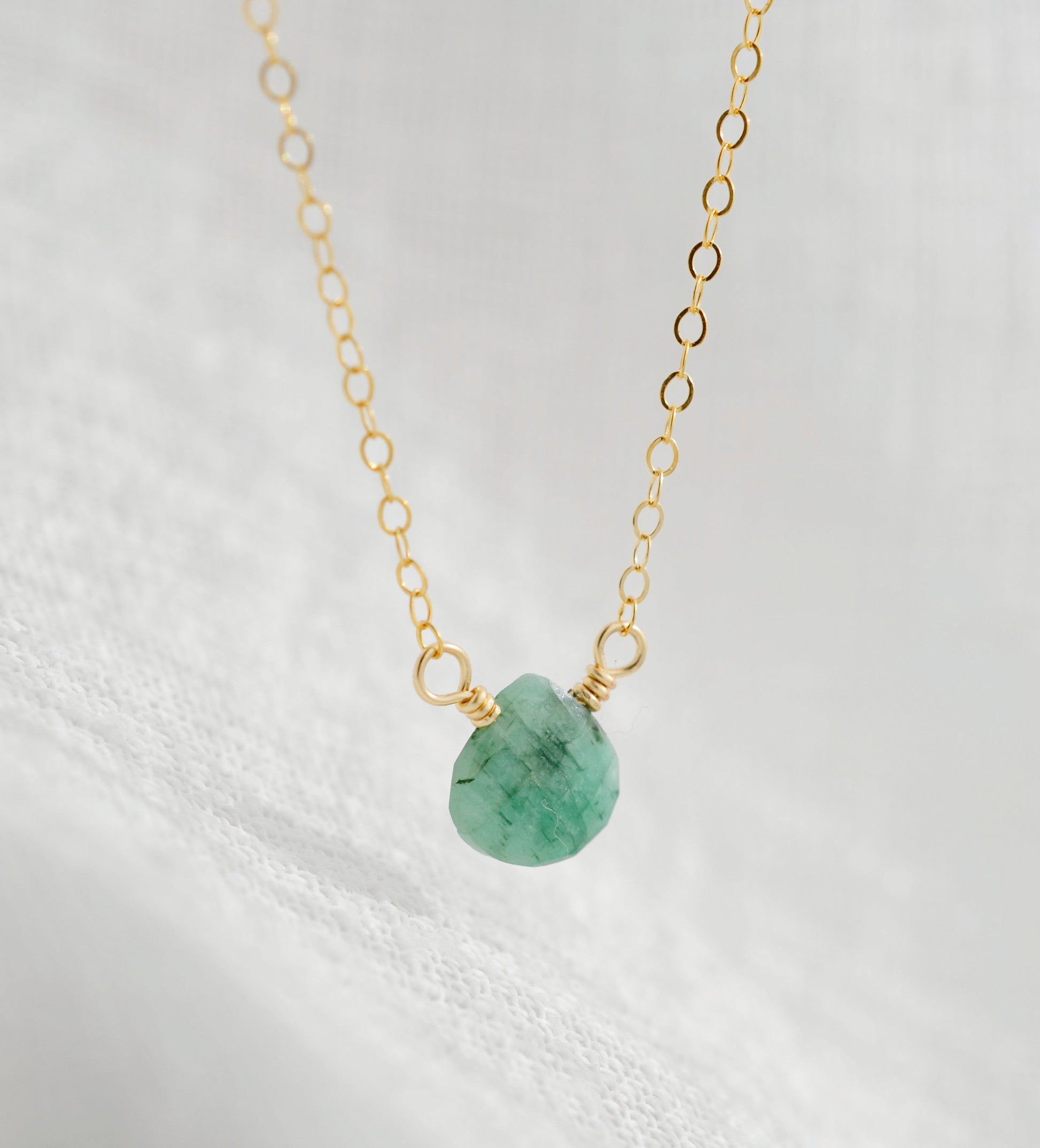 This necklace features a genuine, raw green emerald that's been cut into a faceted teardrop. The colors of each stone will vary from dark to light green with each containing flecks of Black Tourmaline, Biotite Mica, or White Feldspar. Choose between a sterling silver or 14k gold filled style.