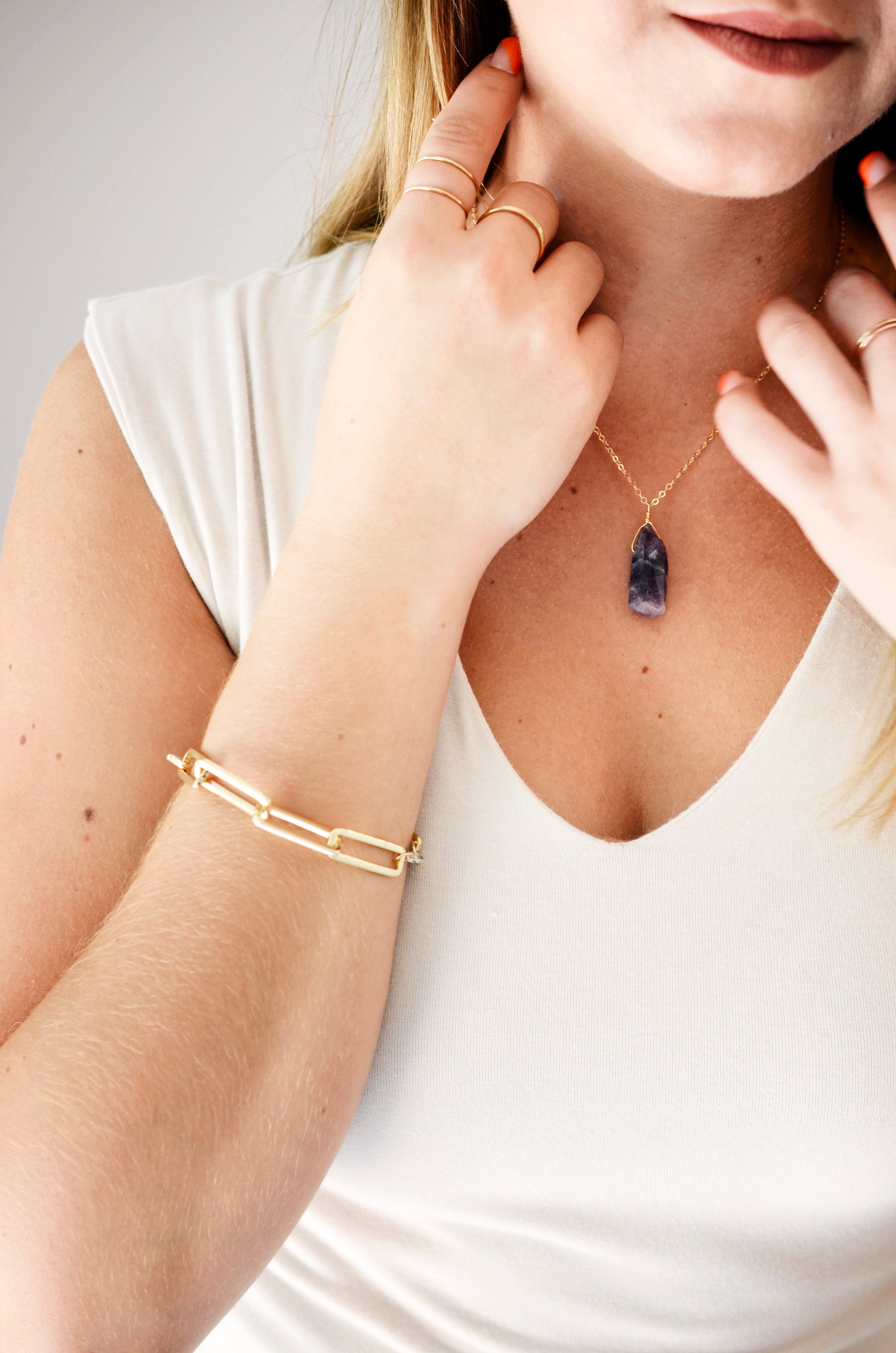 For the February-born or the stone-collector, this raw Amethyst crystal is a celebration of nature’s unedited beauty. Believed to foster a clear mind and creative spirit, each irregular stone is left in its organic state to honor the inclusions and history that make it unique. Hand-set on your choice of sterling silver or 14k gold-filled chain, this piece is a reminder that there is power in being raw and real.