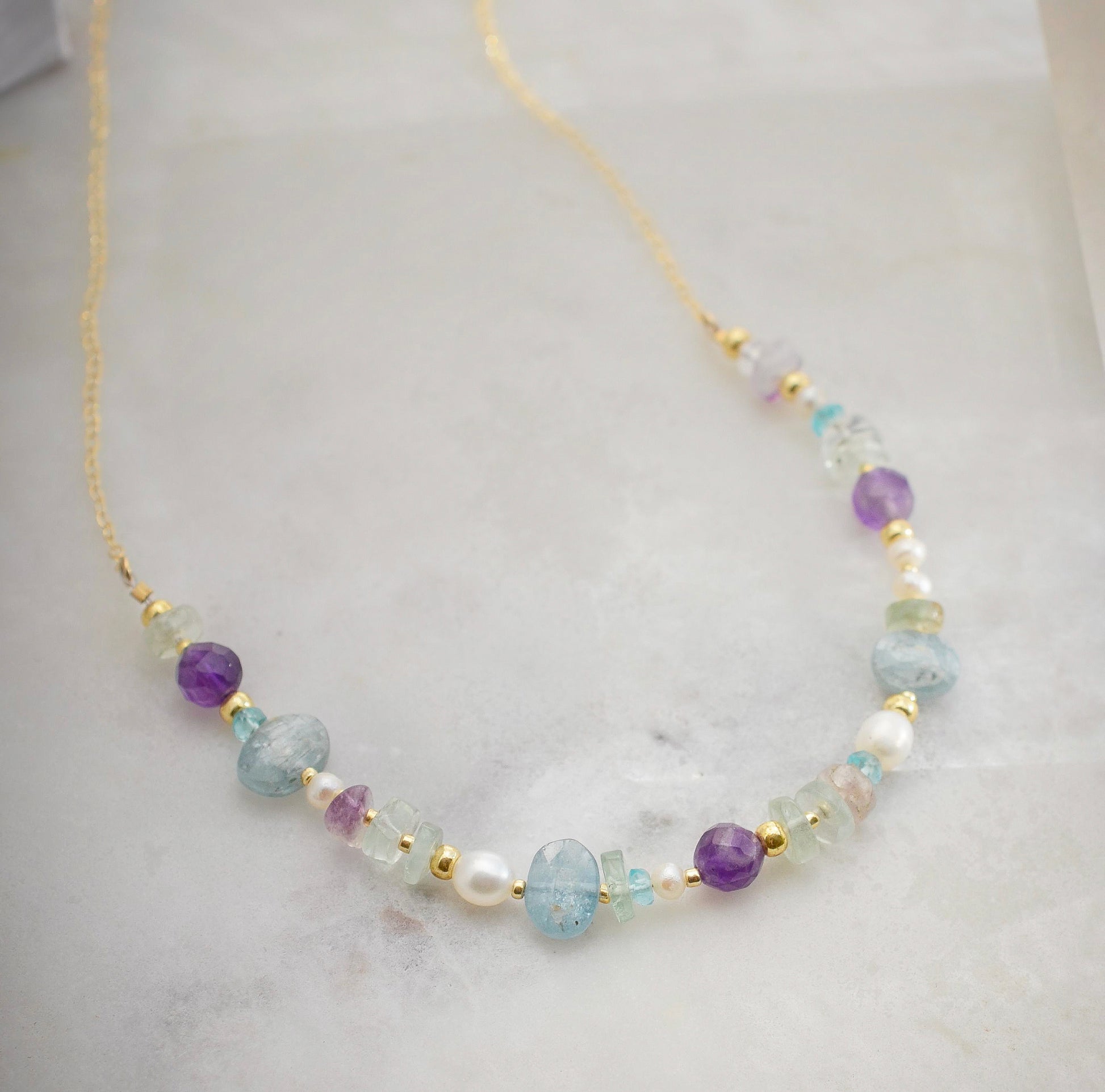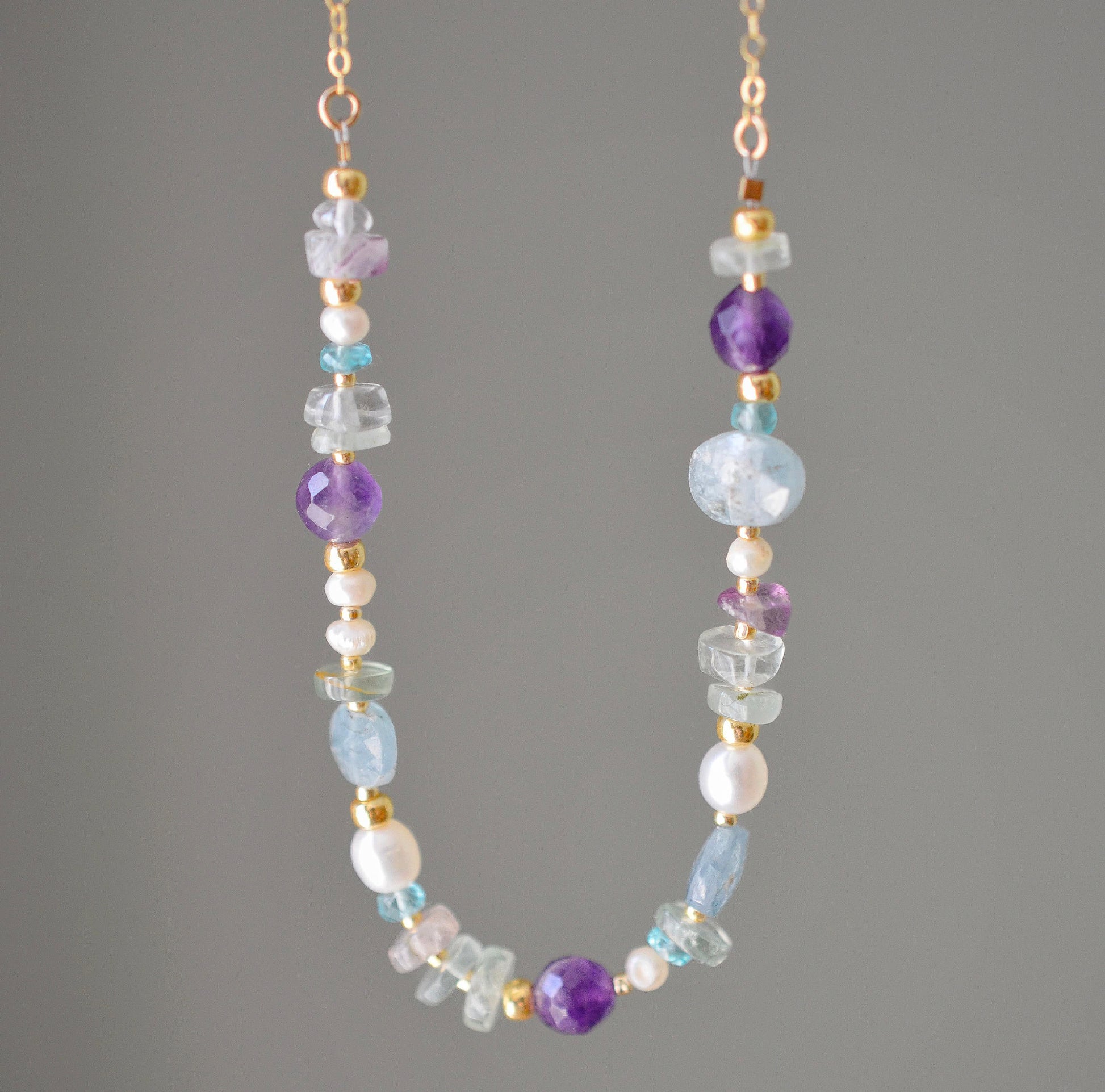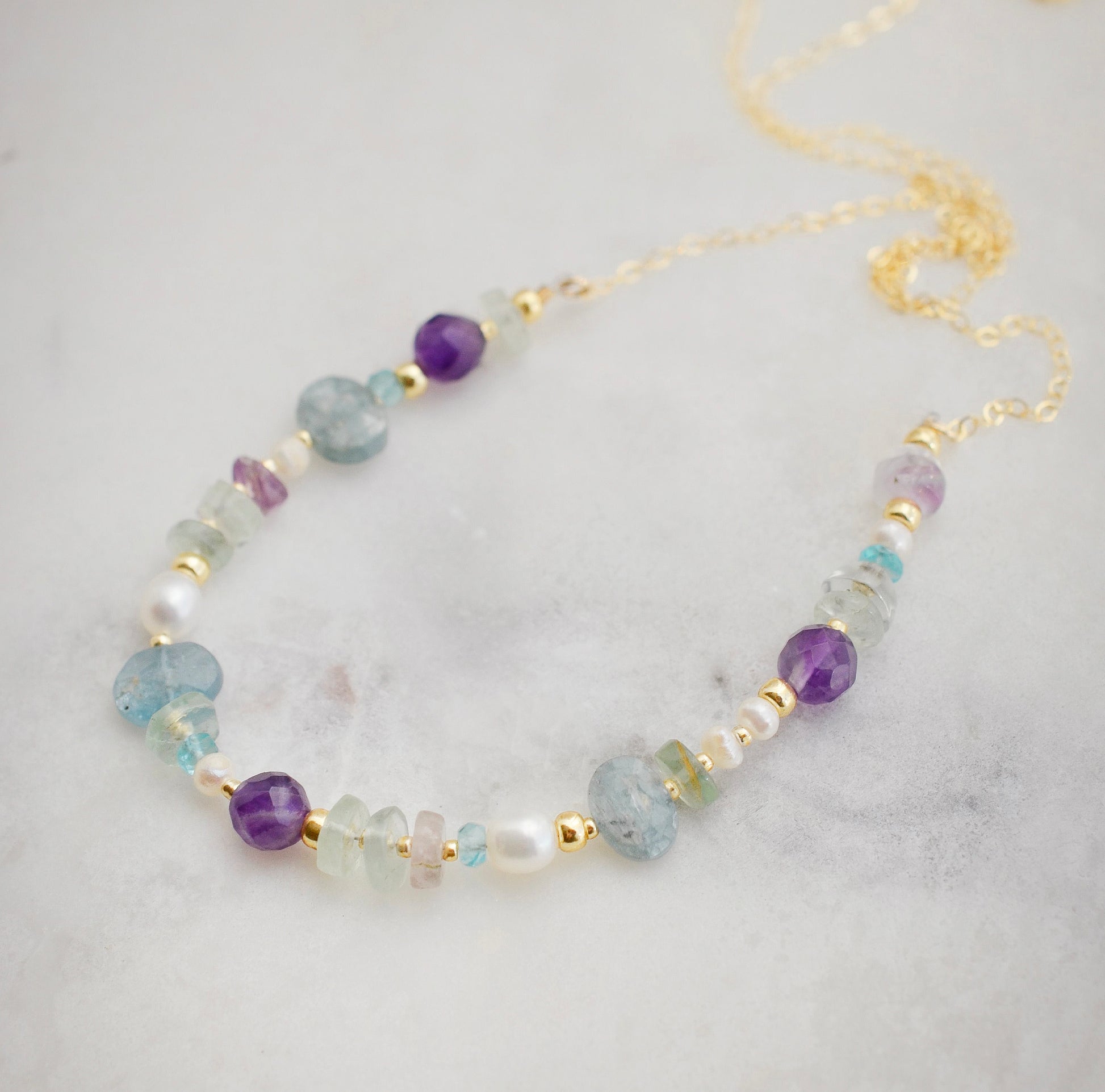 Discover the irresistible spell of Kyanite, Amethyst, Freshwater Pearl, and Fluorite in this hand-crafted necklace. This colorful design, available in 14k gold filled or sterling silver, seamlessly blends the cool tones of natural gemstones into an imaginative design that's ready to style with anything.
